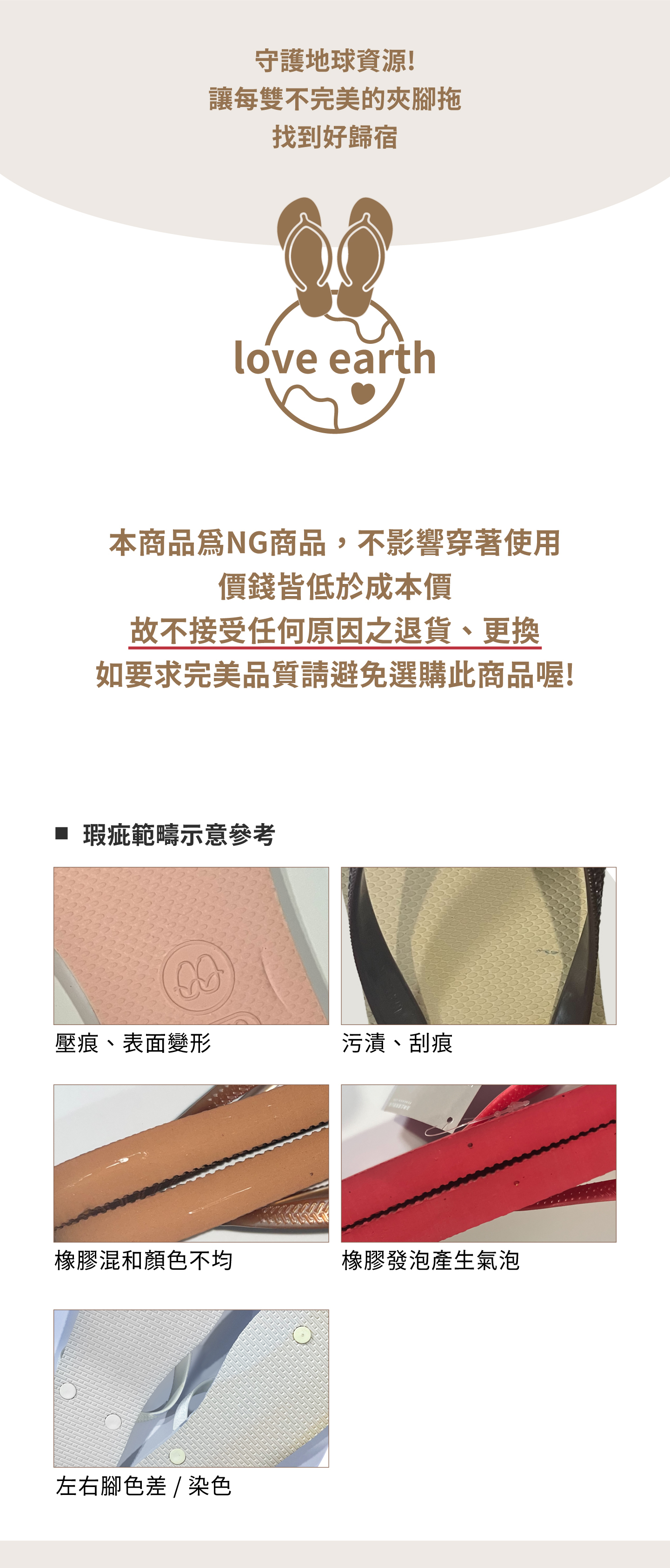 .涼拖鞋均能「正常穿著走路」,出清與微瑕疵狀況可能包含印花模糊暈染、編織紋&初版鞋帶、版型不一、壓痕、褪色、水鑽溢膠、污漬刮痕、色差染色或氣泡...等,絕非回收或二次穿著的鞋款。
